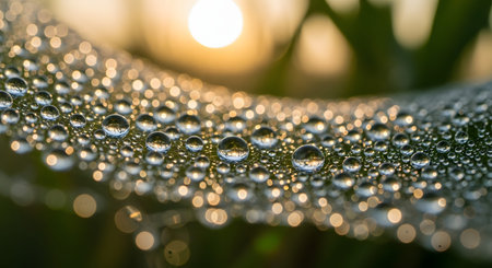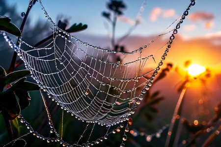 Closeup of dewcovered spiderweb with water droplets reflecting sunrise