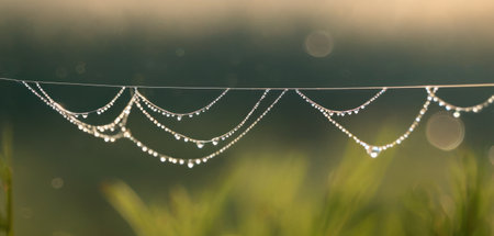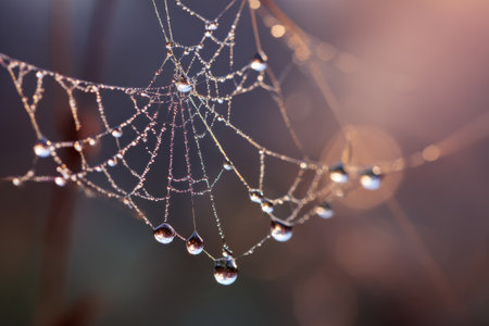 Close-up of glistening dew drops clinging to delicate spider web strands, illuminated by soft morning sunlight