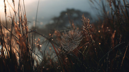A stunning close-up of a spider web adorned with dew drops, capturing the beauty of nature in the early morning light amidst soft grass and a misty backdrop.