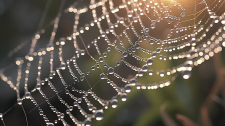 A delicate spider web is adorned with sparkling morning dew drops, illuminated by the golden light of the rising sun. The bokeh background enhances the magical and intricate details of the natural design.