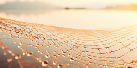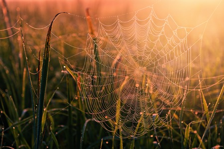 Spiderweb covered in tiny glistening water droplets catches the warm golden light of the rising sun creating a stunning macro photograph of natural engineering set.