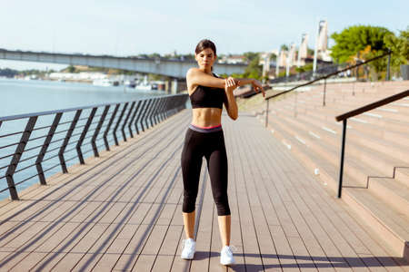 Pretty young woman in sportswear exercising on a river promenade
