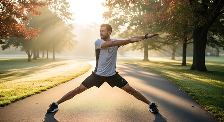 Young man doing stretching exercises in a park on a sunny morning.