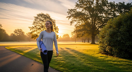 A woman in athletic wear running on a path in a park at sunrise, with lens flare and urban buildings in the background.