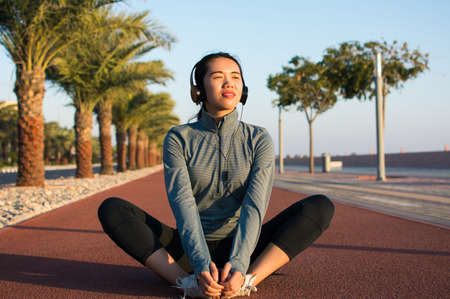 Young beautiful Asian woman in sports outfits doing stretching before workout outdoor in the park in the morning to get a healthy lifestyle. Healthy young woman warming up outdoors.