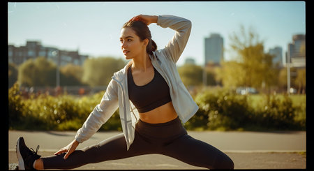 A woman in a sports bra, leggings, and a light jacket stretches outdoors in a park with a city skyline visible in the background.