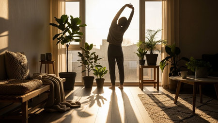 Young woman doing stretching exercises at home. She is standing by the window.