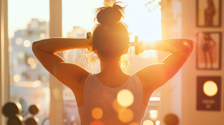 Back view of sporty young woman exercising with dumbbells at home