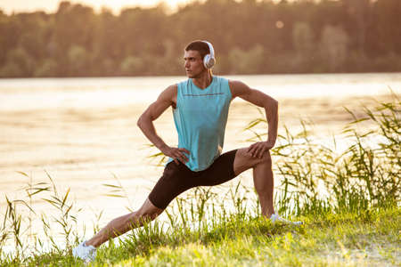 Stretching. A young athletic man working out, training listening to music at riverside outdoors. Concept of healthy lifestyle, wellness, sport, activity, weight loss. Inspired of nature, summertime.