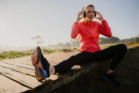 Female athlete stretching listening to music with headphones while sitting on wooden path in forest.