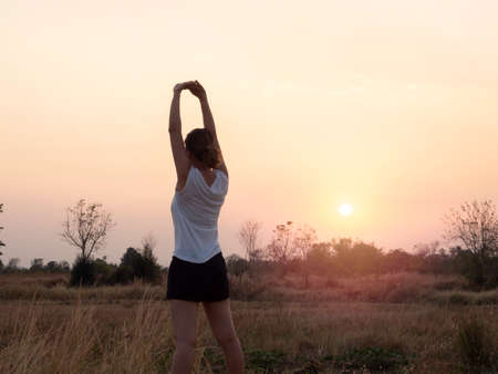 Young woman stretching her arms on beautiful bright sunset sky background near summer field with copy space. Back of female warming up outdoors before exercise. Fitness and healthy lifestyle concept.