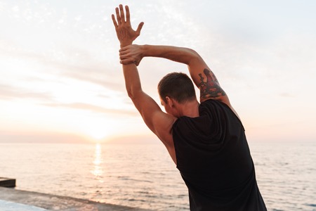 Back view image of handsome strong young sportsman outdoors at the beach make stretching exercises.