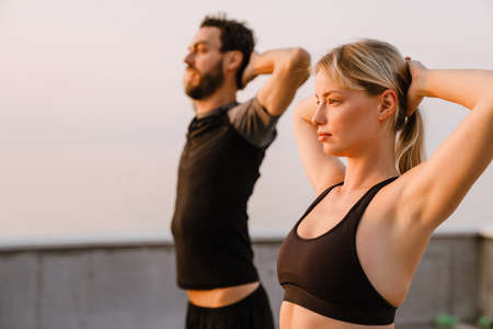 Before workout. Beautiful and active middle-aged couple in sports clothing doing stretching exercises together outdoors