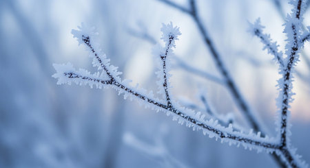 Captivating view of frosty branches against a serene winter landscape at sunrise. This image captures the beauty of nature during the cold season.