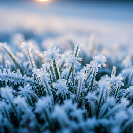 A stunning close-up of frosty grass glistening with ice crystals in the early morning light, showcasing the tranquility and beauty of nature during winter.