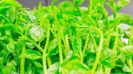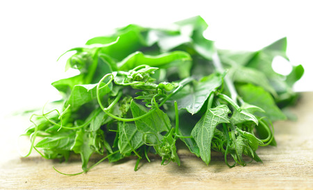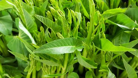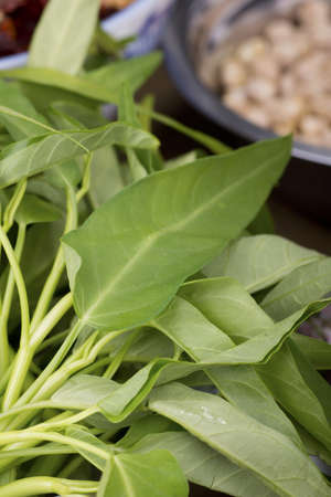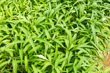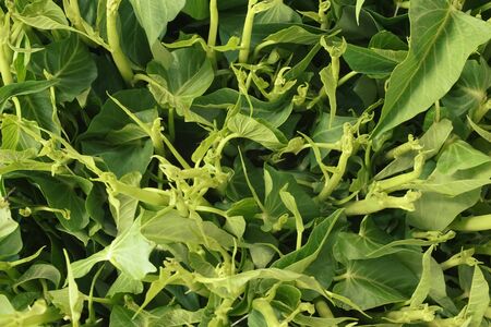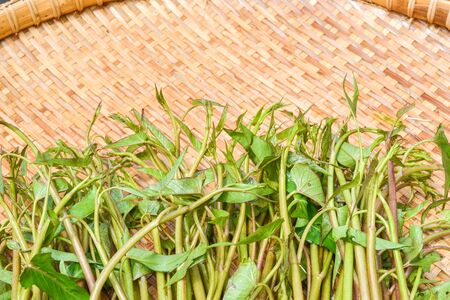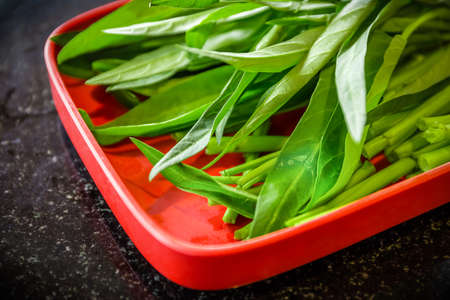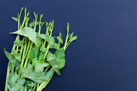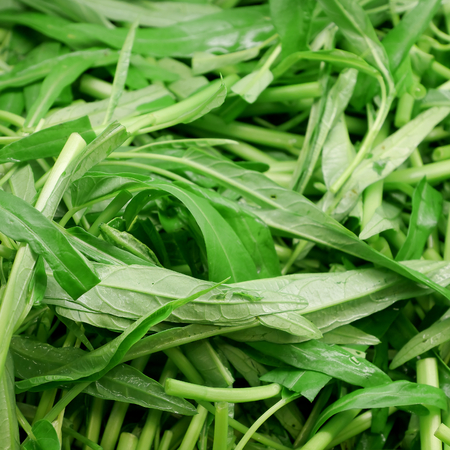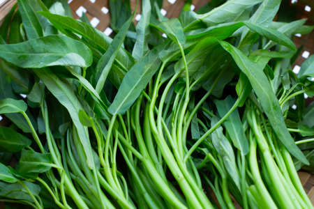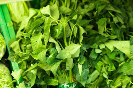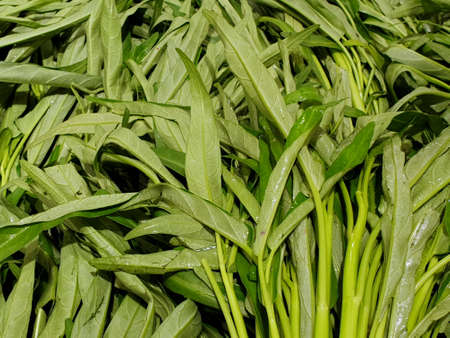 Top view of fresh morning glory leaf as a background for sale in the supermarket, for making cooking, healthy food concept