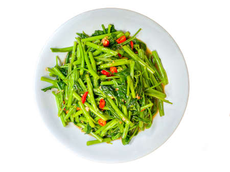 Stir-Fried Chinese Morning Glory or Water Spinach isolated on white background