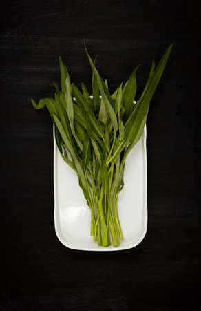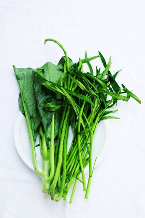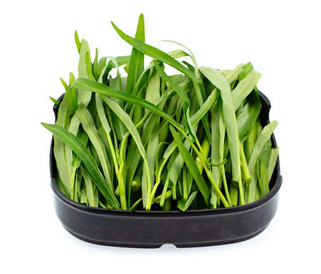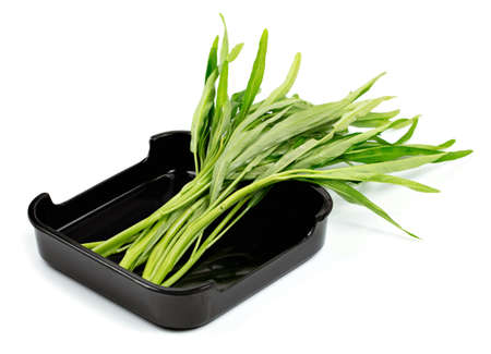 Fresh Chinese morning glory vegetable on dish isolated on white background