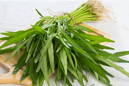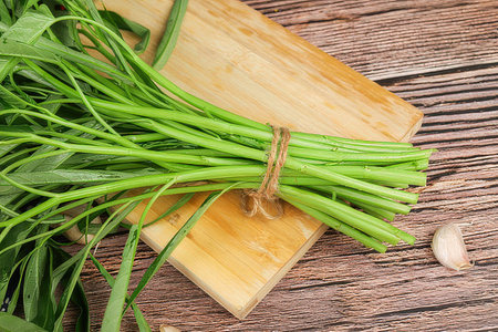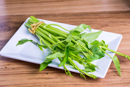 Morning glory on the wooden table. Morning glory is rich in many important vitamins and minerals.