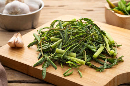 Vegetable, A Bowl of Fresh Green Cowpeas, Leucaena Leucocephala and Gotu Kola Leaves on Wooden Table with Copy Space for Text Decorated.