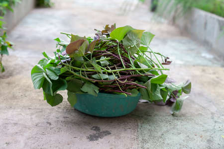 Fresh organic chayote shoot leaf in a basket holding by hand prepare for cooking