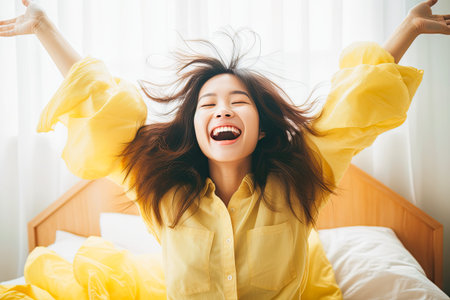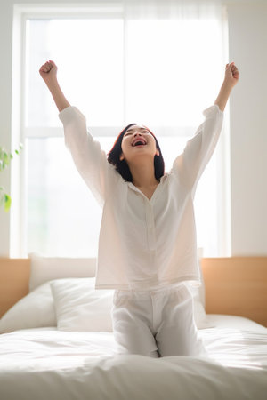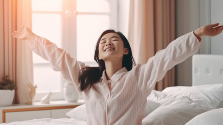 Joyful Asian woman awakens, stretching in a sunlit bedroom, embracing the serenity of a new day. AI generative.