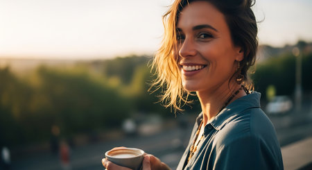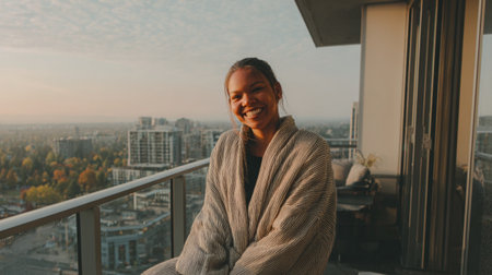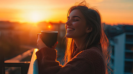 A woman smiling while sipping coffee on a balcony, overlooking a sunrise, feeling relaxed and motivated to start the day.