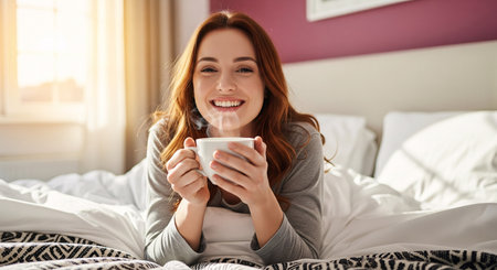 Woman coffee cup morning light bedroom bed window curtain smile relaxed mood woman coffee cup morning light bedroom bed window