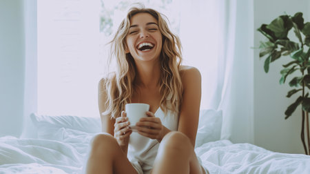 A joyful woman enjoys a cup of coffee while sitting on a cozy bed in a bright, sunlit room filled with plants