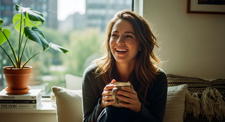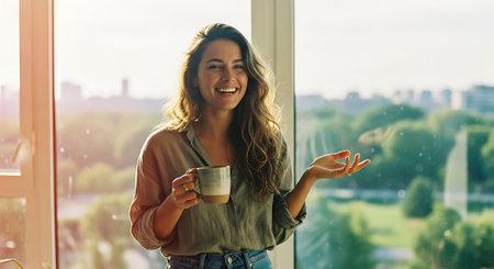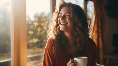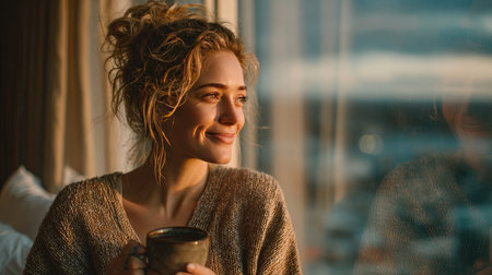 A young woman sits by the window, savoring her coffee with a warm smile. Golden sunlight illuminates her cozy space, reflecting tranquility and serenity.