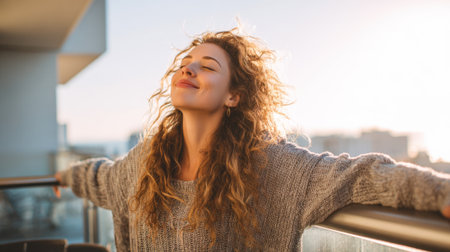 Woman stands on balcony arms open wide basking in warm sunset glow with a blissful smile.