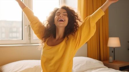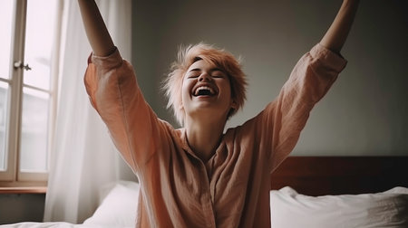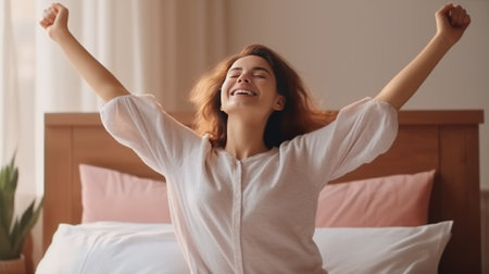 A young woman enjoys a peaceful morning stretch in her sunlit bedroom, embracing a moment of relaxation and positivity as she welcomes a new day.