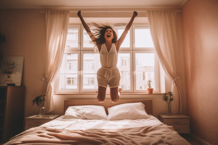 Generative AI : happy young woman laughing and jumping on the bed in the morning at home