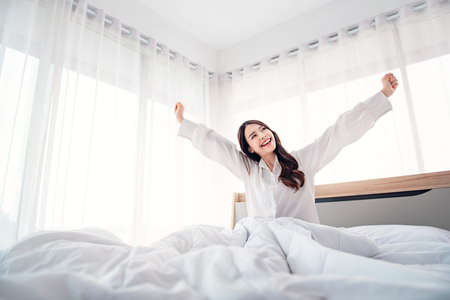 Asian young woman stretching on bed after waking up in morning at her bedroom.