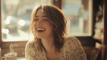 Cheerful young woman laughing joyfully while sipping coffee in a cozy sunlit cafe, surrounded by warm and inviting light.