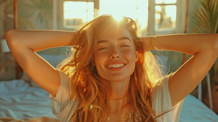 A young woman stretching in bed, smiling as sunlight streams through the window, starting her morning with positivity.