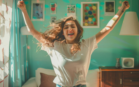 Amidst a colorful and sunlit interior, a woman's ecstatic dance captures her unbridled joy and the invigorating essence of a bright new day