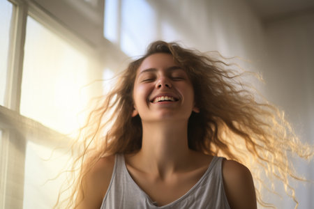 Woman with curly hair, arms raised in sunlight near a window, eyes closed, joyful