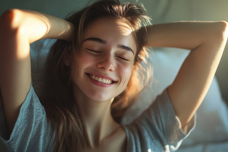 A young woman smiles and stretches comfortably in bed while sunlight illuminates her face, creating a calm atmosphere.