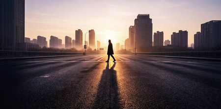 Silhouette of Man Walking Down Center of Empty City Boulevard at Golden Hour
