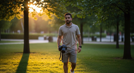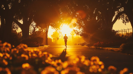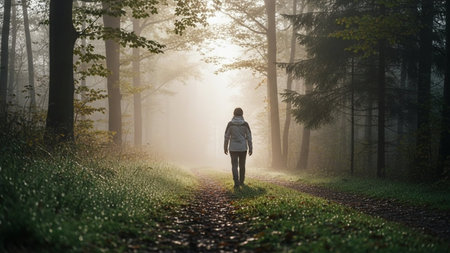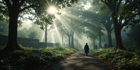 A person walks along a sunlit path, showcasing vibrant greenery and a peaceful atmosphere. This image embodies outdoor exercise, vitality, and connection with nature.