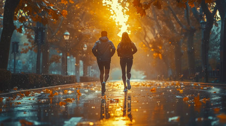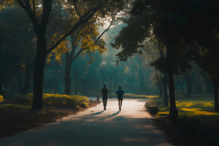 Two friends enjoying their morning jog in a peaceful and scenic urban park as the sun rises
