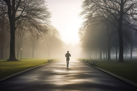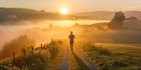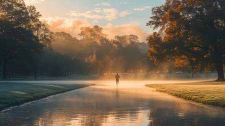 A morning jogger running along a misty river track, representing fitness, health, and serenity in nature.