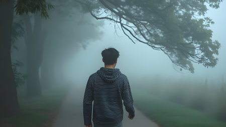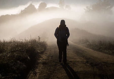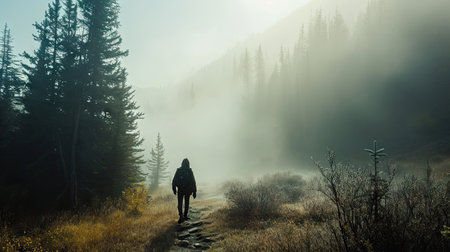 Solitary traveler walking along path in misty foggy landscape. Moody atmosphere wallpaper. Nature journey solitude.