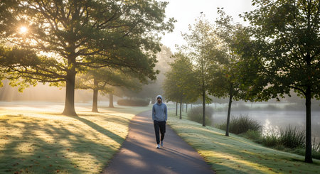 A man in a grey hoodie walks on a paved path through a park on a tranquil, misty morning. The rising sun casts golden light and long shadows through the trees.