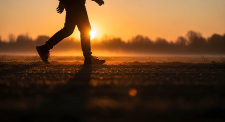 A low-angle silhouette shot of a person's legs walking across a field during a golden sunrise. The backlighting highlights the dew on the grass and creates a warm, energetic atmosphere of morning exercise or travel.