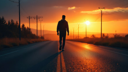 A low-angle, rear view of a man in jeans and a t-shirt walking down the center of an empty, rural asphalt road towards a beautiful, golden sunset. The warm light casts a long shadow in front of him. This image represents a journey, new beginnings, and moving forward.