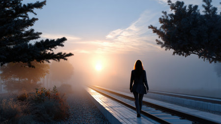 A woman walks on a train track at dusk. The sky is orange and the sun is setting. The woman is carrying a handbag