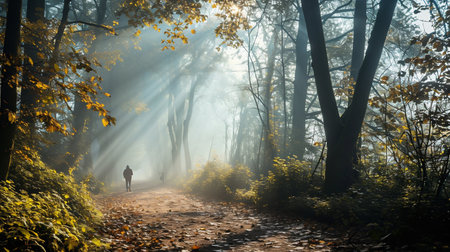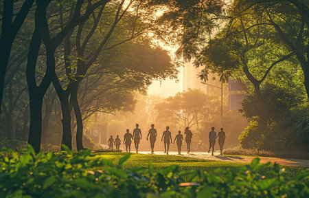 Capture the allure of morning tranquility as walkers navigate through a misty park, enveloped by soft light and distant trees, creating a serene atmosphere.