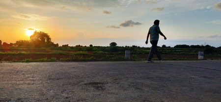 A person is seen walking alone on an empty asphalt road during a sunset, with the road flanked by fields and power lines, symbolizing solitude and the journey ahead.